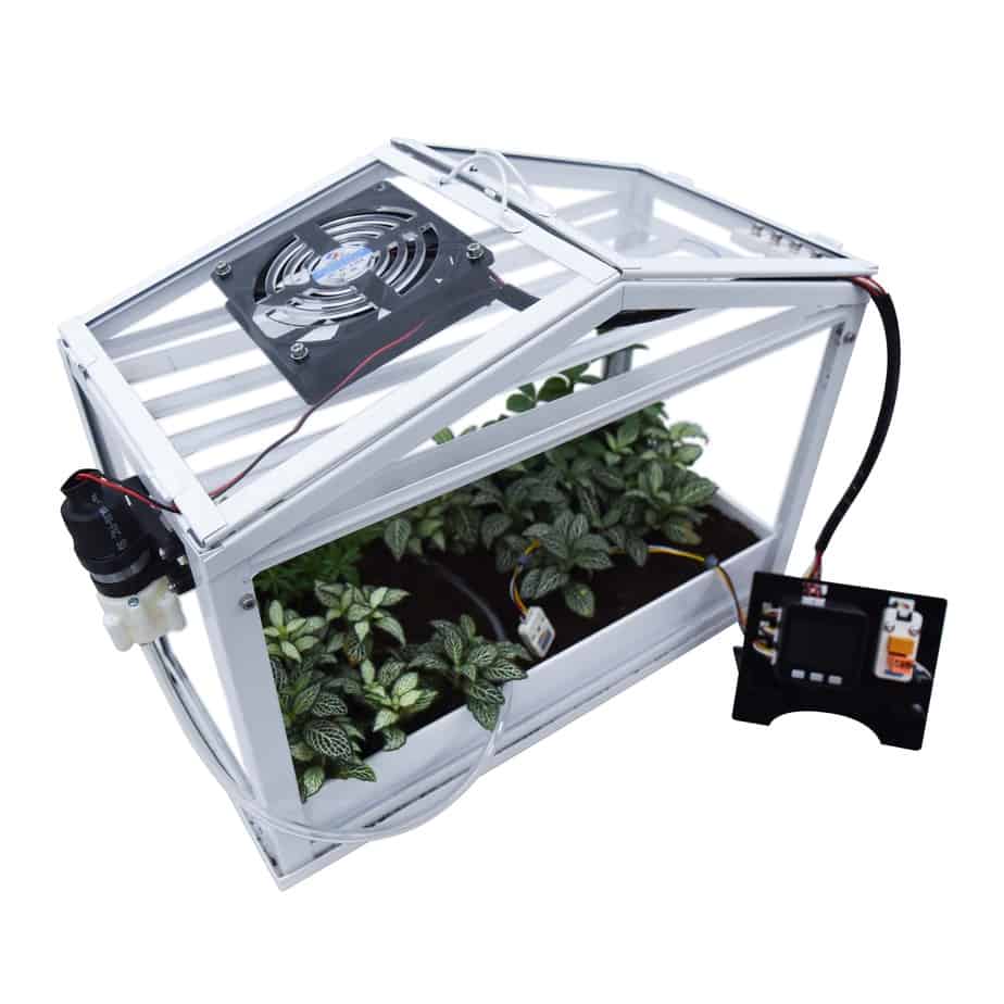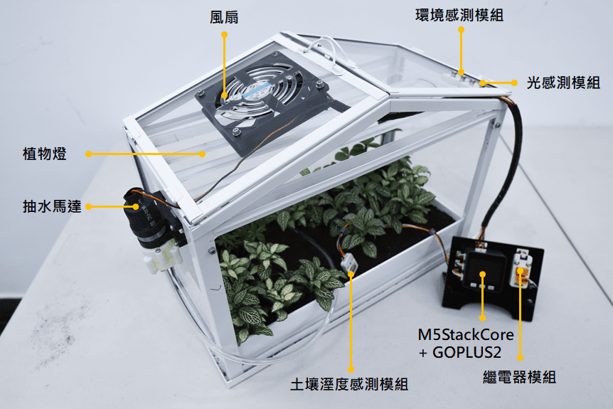 為確保高經濟作物避免宵小的竊盜,智慧溫室設置的物聯網感測器提供比起傳統監視器更為靈活的監控系統,不僅費用較為低廉,透過不同程度的感測器整合,更能夠主動的監控門禁狀態。如:自動警報系統、員工出勤紀錄等。 「智慧植栽」即是模擬智慧溫室而研發、設計的教學教具,整體以M5Stack Core Basic 為運算核心,搭配各式感測器監控植栽的環境數據(土壤溼度感測器、光強度感測器)並上傳雲端保存紀錄。學生能夠透過M5Stack的UIFLOW 編輯器使用 Blockly撰寫程式,模擬一個自動照顧植栽的系統,依據感測器蒐集所得的數據,調控植物生長的環境數值。如:缺水時自動灌溉系統、延長植栽光照時數的植物燈、模擬控制溫室內溫濕度的風扇等。